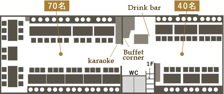 当店2階のパーティースペースは最大110名様まで着席可能です。テーブル席とソファー席のレイアウトも自由自在。会社の忘新年会や歓送迎会・結婚式二次会や同窓会・慰労会まで様々なシーンでご利用を頂いております。